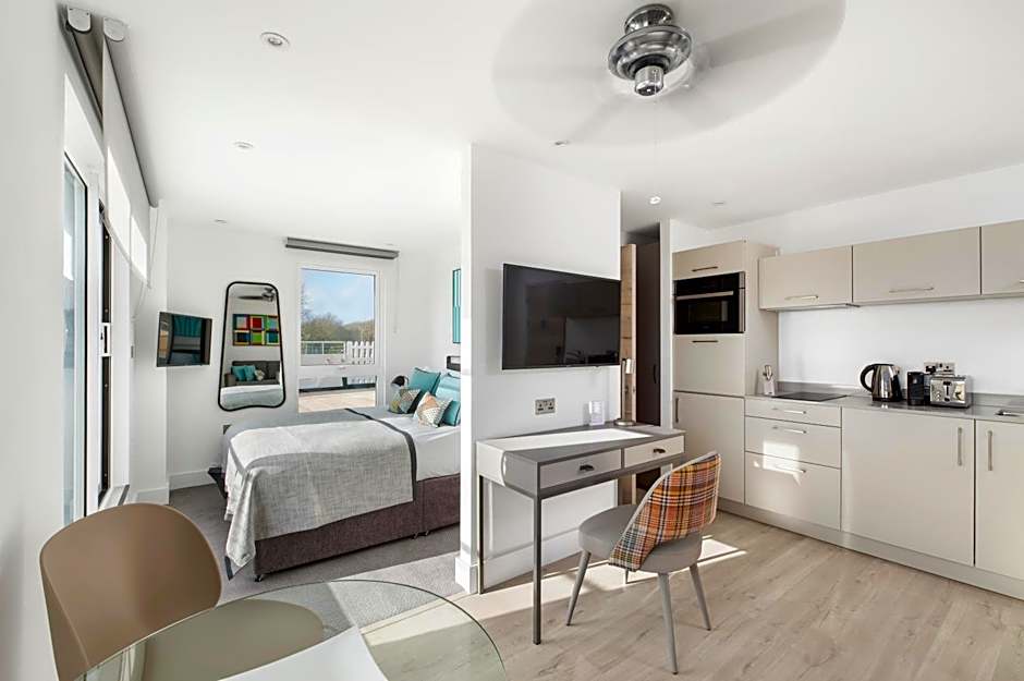 These studio suites with a terrace or a balcony, are well-lit and furnished with an open plan design. They feature a kitchen, a bathroom with shower and a king-sized bed.You’ll also get complimentary access to a wide range of digital publications, Wi-FI, Chromecast TV and the on-site gym.
